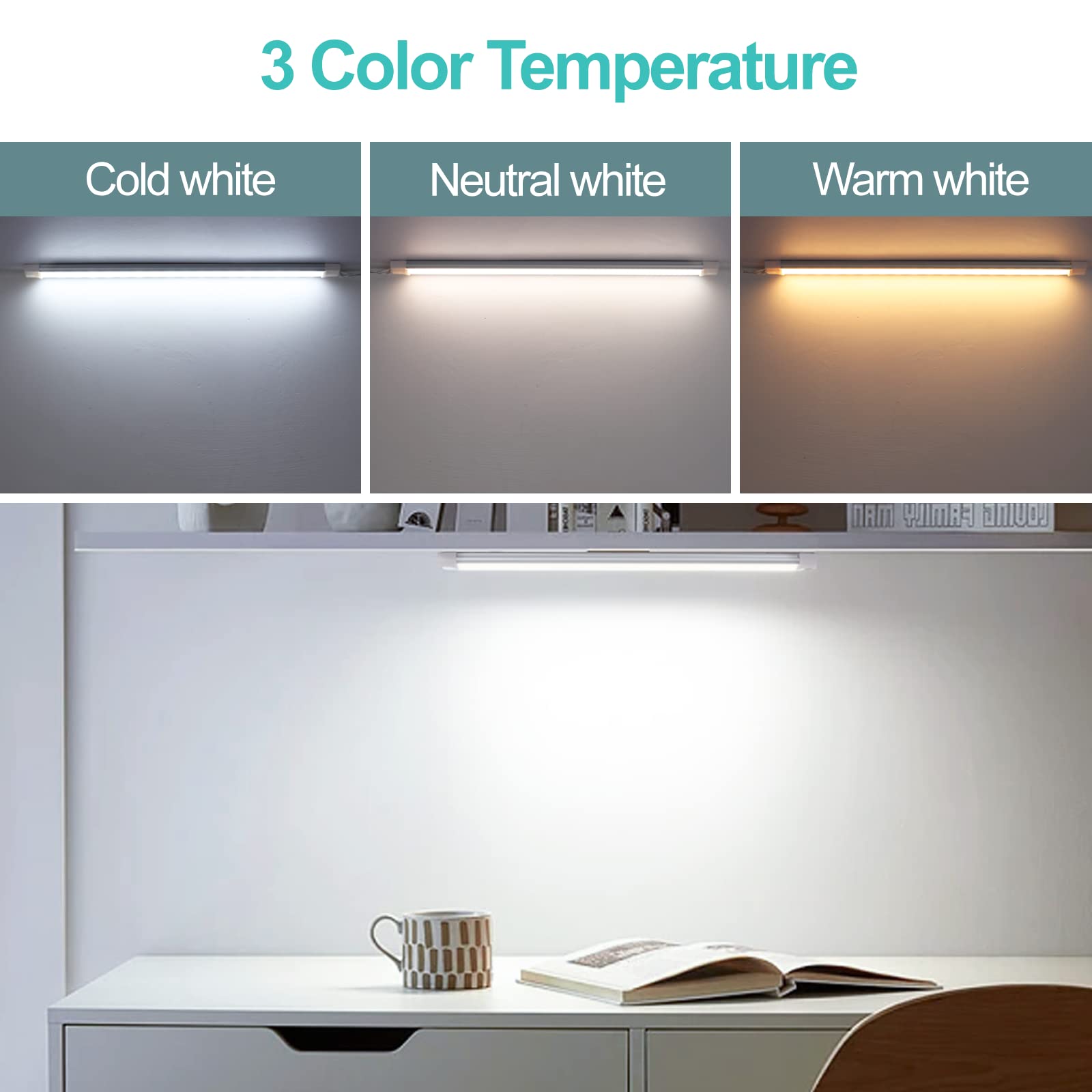 - Super Bright: LED under cabinet lights provide Warm white 3000K, natural white 4000K, and cold white 6000K. Touch the button to turn on/off the light or switch the color temperature. Long touch to adjust brightness. These under-cabinet led lights are great for lighting up any space in your room.
