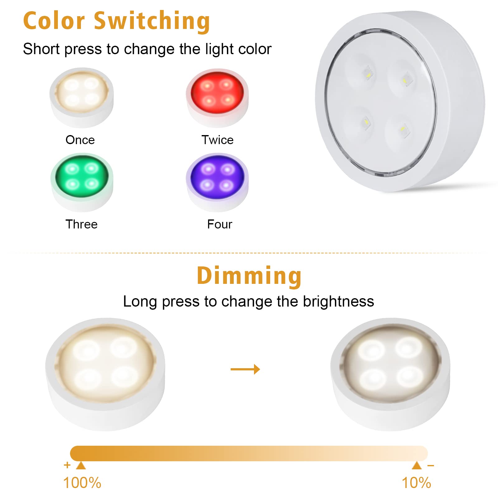 Say goodbye to manual adjustments! With the included remote control, you gain effortless command over brightness levels, color options, and even a timing function. Set these puck lights to automatically turn off after a specified duration for added convenience and energy efficiency. Choose between a wide range of hues or create a calming white light for your everyday tasks. Adjustable settings make it easy to achieve the ideal illumination, tailored specifically to your needs.